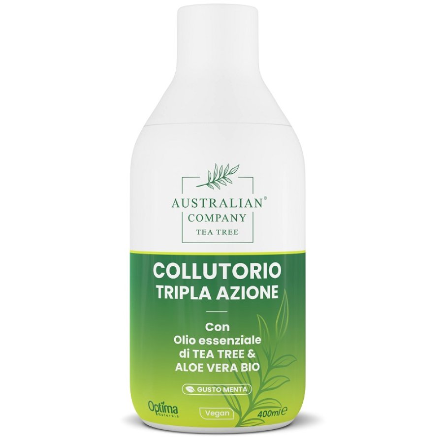 Collutorio tripla azione con olio essenziale di tea tree e aloe vera biologica.