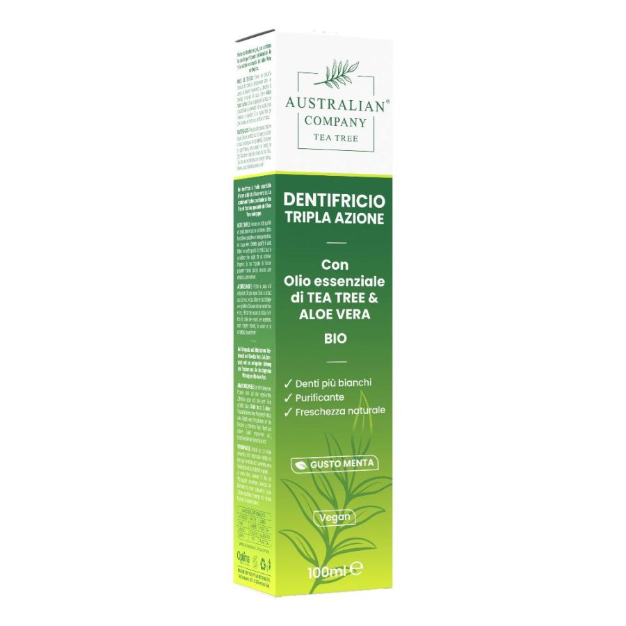 Dentifricio tripla azione con olio essenziale di tea tree e aloe vera biologica.