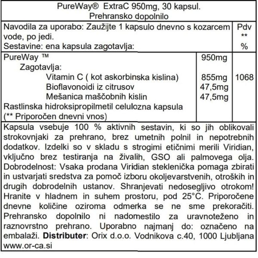 Extra Pureway C 950 Milligrammi 30 Capsule Integratore di Vitamina C ad Alta Biodisponibilità per le Difese Immunitarie